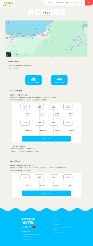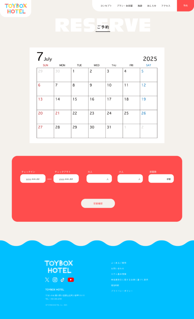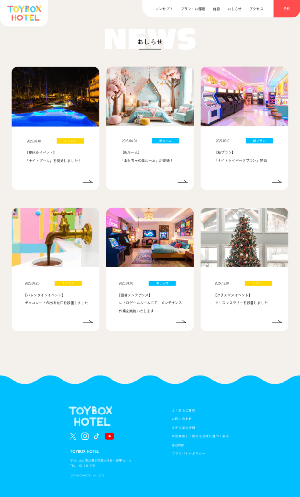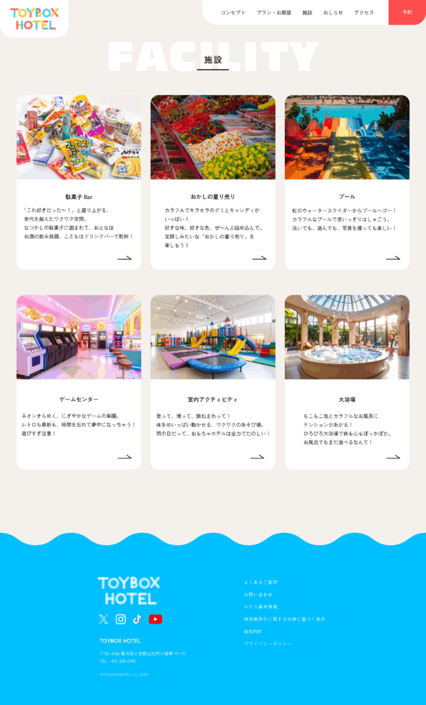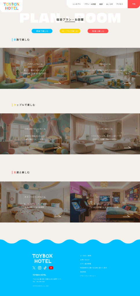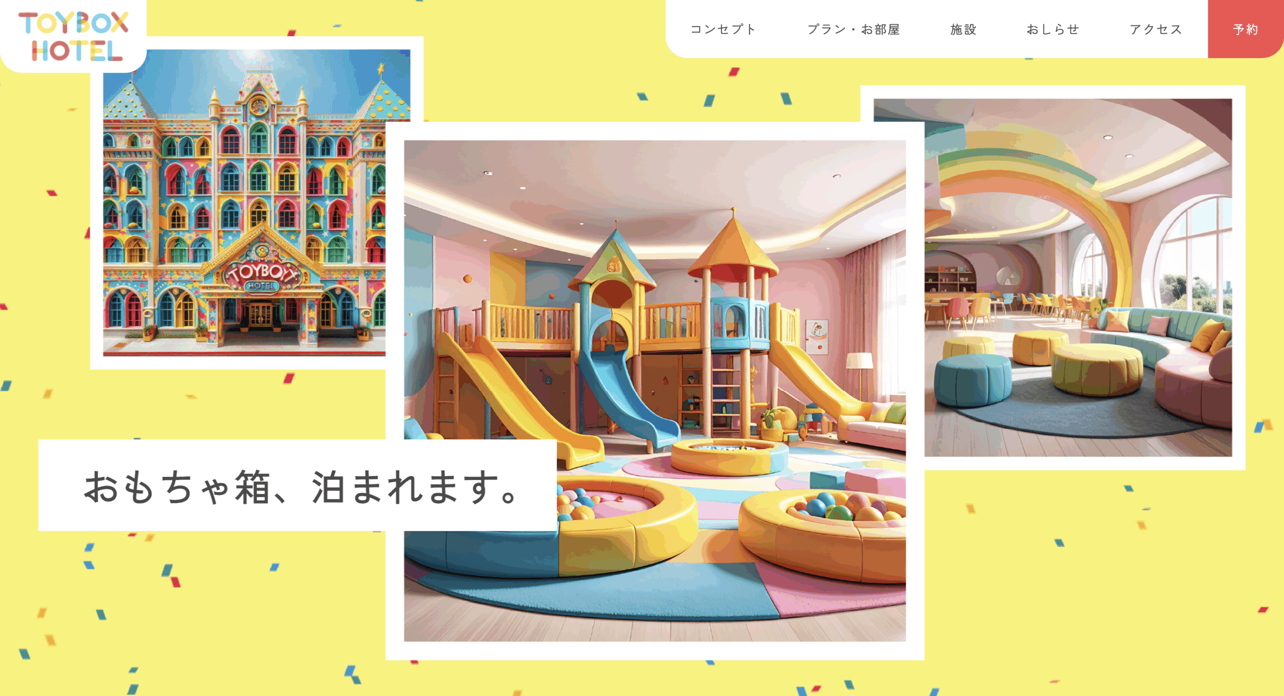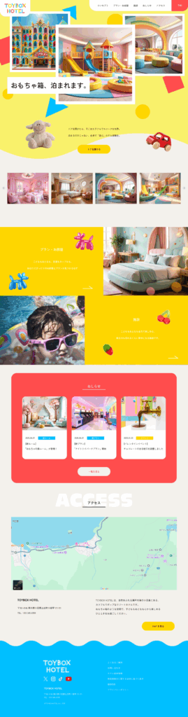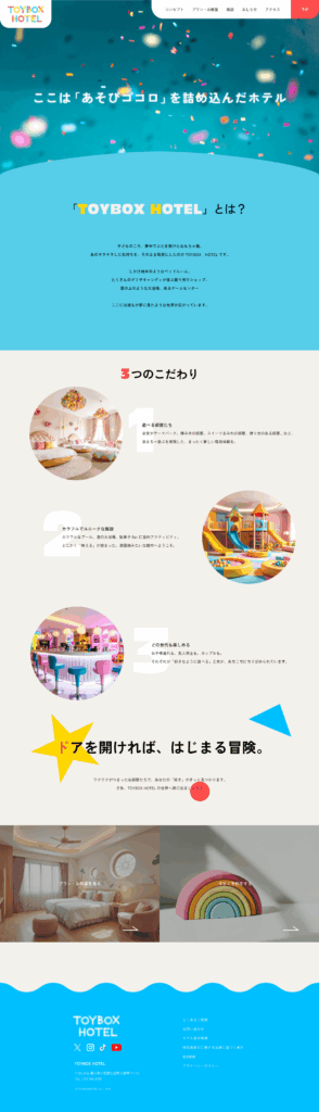 架空のファミリーホテル「TOYBOX HOTEL」のWebサイトを制作しました。
